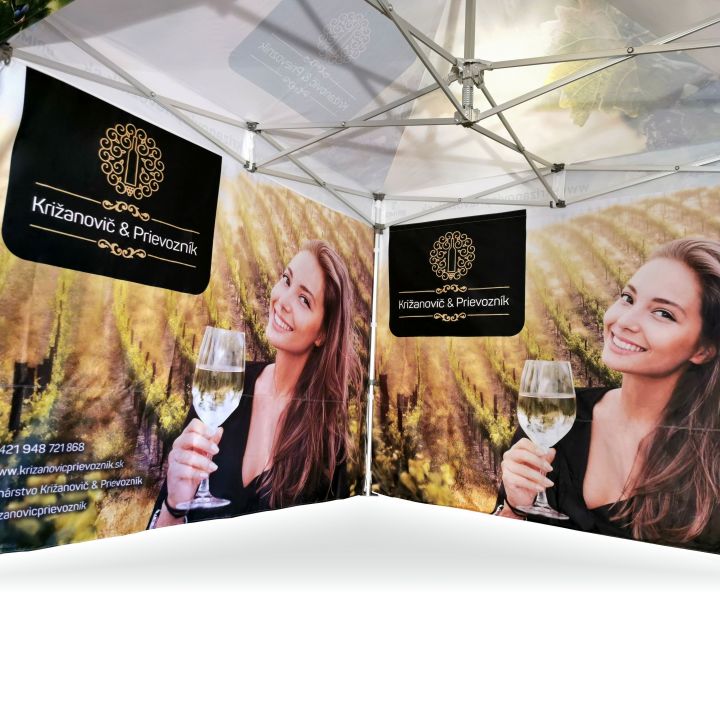 Reclame tenten met digitale sublimatieprint. Het printen gebeurt via een chemisch proces waarbij de inkt onder invloed van hoge temperatuur direct in de structuur van de stof doordringt. Logo, tekst of welk type grafiek dan ook aan de binnen- of buitenkant van de tent, volgens de wensen van de klant.