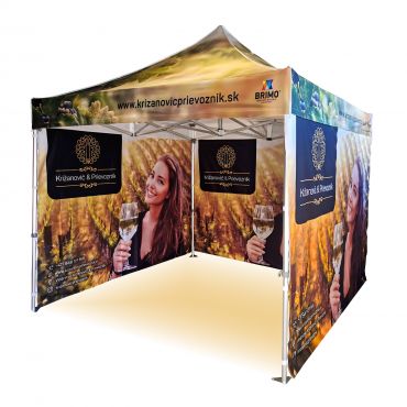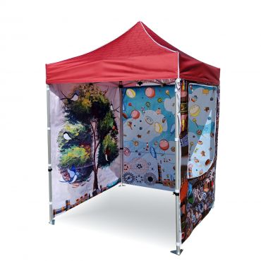 Reclame tenten met digitale sublimatieprint. Het printen gebeurt via een chemisch proces waarbij de inkt onder invloed van hoge temperatuur direct in de structuur van de stof doordringt. Logo, tekst of welk type grafiek dan ook aan de binnen- of buitenkant van de tent, volgens de wensen van de klant.