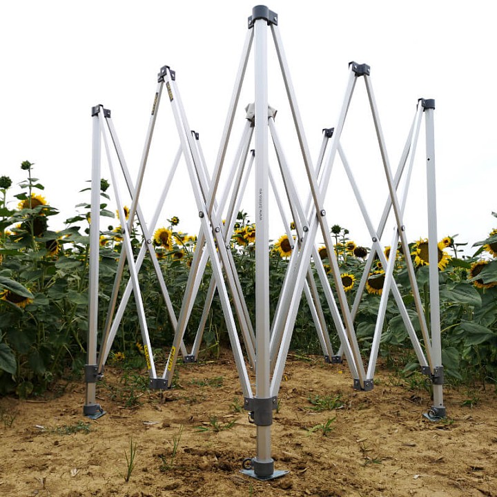 De basis wordt gevormd door een innovatief schaarmechanisme dat zorgt voor een probleemloze en razendsnelle opstelling van de tent. In opgevouwen toestand is de constructie slechts 2 meter lang, wat de logistiek en het transport aanzienlijk vereenvoudigt. Het frame maakt gebruik van massieve zeshoekige (hexagonale) poten, waardoor het geheel extreem stabiel is. Vergeet echter niet dat een grondige verankering cruciaal is – voor absolute veiligheid moeten zelfs de meest massieve modellen altijd betrouwbaar aan de grond worden bevestigd.