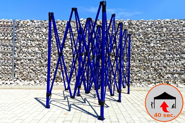 De kleur van het frame is koningsblauw. Deze kleur geeft de hele tent een exclusieve uitstraling. Hij onderscheidt zich van de concurrentie, is iets nieuws op de markt – iets wat iedereen wil hebben. Wij geloven dat elke ondernemer wil opvallen in de massa, daarom hebben wij deze exclusieve tent met een onconventionele framekleur aan ons aanbod toegevoegd.