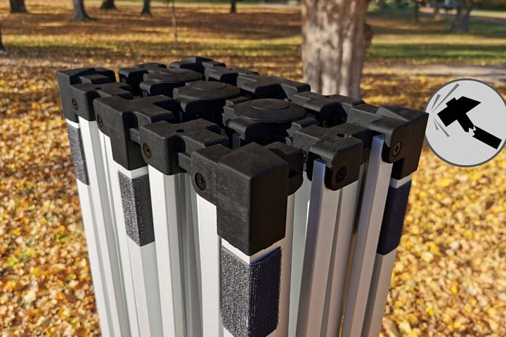 Het moderne ontwerp zal je bevallen. De aluminium constructie is ultralicht van gewicht en de tent is gemakkelijk te verplaatsen. Dankzij het automatische opvouwsysteem kan de tent 3x6m snel worden opgevouwen en opgezet op elke locatie. Er zijn geen extra gereedschappen nodig. Onderdelen kunnen eenvoudig worden vervangen door schroefverbindingen.